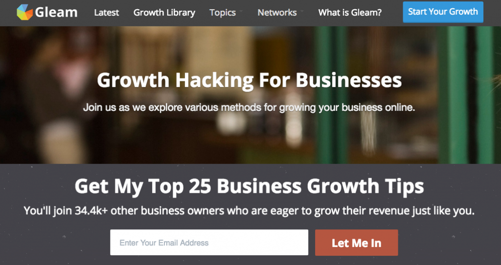 The most effective and frequently utilised way of using eBooks to generate leads, is by leveraging their perceived value to sign up prospect your mailing list. I call this a ‘carrot eBook’, because your publication is positioned as a ‘dangling carrot’ which your website visitors simply cannot resist, and thus willingly hand over whatever details you ask of them when prompted (most commonly their email address) in order to get their hands on that juicy carrot. One fine example of this is the ‘Top 25 Business Growth Tips’ eBook created by the crew at Gleam.io, pictured below.