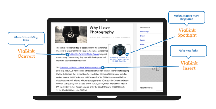 Now for something completely different! Viglink is a system that is unique within the in-text ad space. Strictly speaking, Viglink is not an in-text ad, but rather, an affiliate link re-writing service. Nevertheless it still feels most applicable to the in-text category due to the way the tech works. What Viglink does, is convert standard outgoing links into affiliate links. For example, if I was writing a blog post about the latest Macbook Pro and linked to it, and then a visitor to my site followed this link and made a purchase, Viglink would give me commission for this sale.